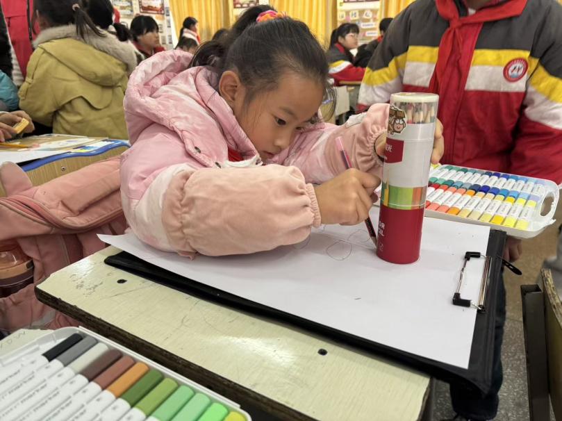 致辞结束后,学生代表依次走到台前,从志愿者手中接过画笔,轻轻抱在胸前。操场上随之响起掌声,不喧闹,却格外真诚。随后,其余画笔被老师带回教室,逐一分发到每个孩子手中。这些画笔最终落在了一张张课桌上,也悄然连接起一次公益行动与孩子们的日常学习时光。